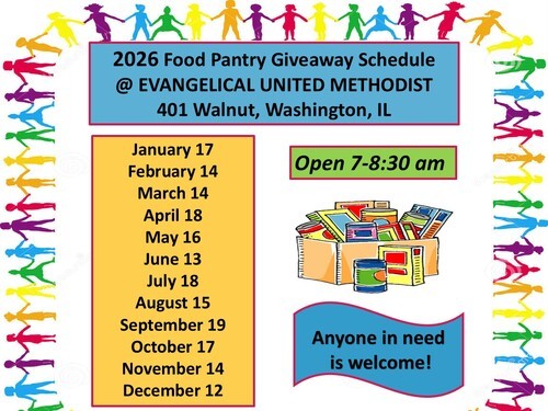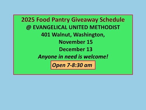 Help is especially needed at 8:30 am on the Thursday before the Pantry Give-Away to unload items from Midwest Distribution Center and set-up. Help is also needed on the Giveaway day. Come at 6:30 am that Saturday. If you have questions about helping or anything else, use the "Questions or Comments" button on this page or contact the church office .